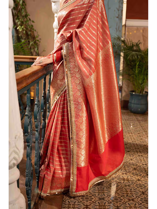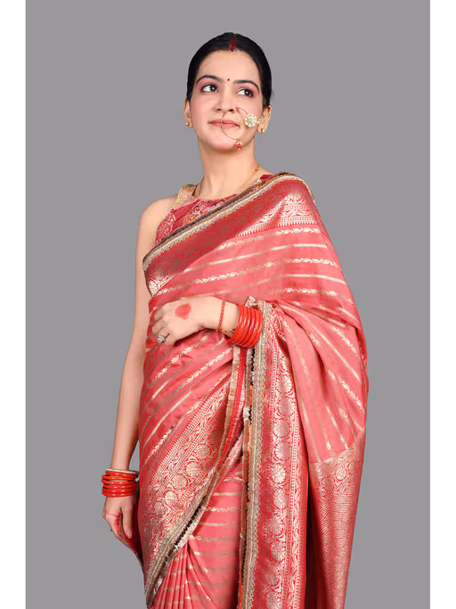 HomeSareeBlush Coral Pure Silk Banarasi Handloom Saree with Unstitched Blouse
